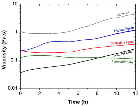 Viscosity as a function of time for resin without lignin (black), and BPF resins with 30 wt% dealkaline lignin (red), alkaline lignin (blue), lignosulfonate (green), and lignin-LA (gray). All the resins were produced using 2 wt% NaOH. The shear stress and temperature were kept constant at 10 Pa and 20 °C, respectively.