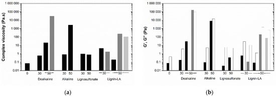 (a) Complex viscosity of resins; (b) G’ (full bars) and G’’ (empty bars) of resins (5 Pa, 1 Hz, 20 °C) with 0, 30 and 50 wt% of lignin, prepared with 2 wt% (black), 3 wt% (gray), and 4 wt% NaOH (light gray).
