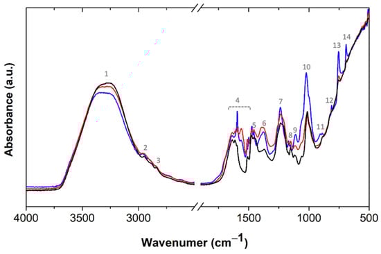 Infrared spectra were recorded with a Thermo Nicolet 380 FTIR apparatus (Thermo Scientific, Waltham, MA, USA) equipped with a Smart Orbit Diamond ATR system. The spectra were measured from 4000 to 400 cm−1, in the absorbance mode, with a total of 68 scans and a resolution of 8 cm−1. Background spectra were collected before every assay.