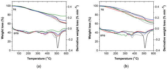 TG and DTG curves of resin without lignin (black), (a) with 30 wt% lignin; (b) with 50 wt% lignin. The used lignins were: dealkaline lignin (red), alkaline lignin (blue), lignosulfonate (green), and lignin-LA (gray). Note that all resins are optimized formulations (i.e., free formaldehyde content < 1 wt%).
