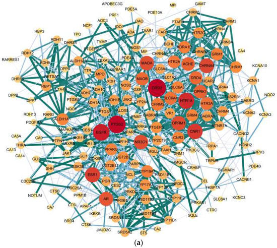 The final ranking of the 14 targets in this core network (Table 4) was SLC6A4 (sodium-dependent serotonin transporter), CNR1 (cannabinoid receptor 1), ACHE (acetylcholinesterase), HTR1A (5-hydroxytryptamine receptor 1A), DRD2 (dopamine D2 receptor), MAOA (monoamine oxidase type A), CHRNA4 (neuronal acetylcholine receptor subunit alpha-4), NR3C1 (glucocorticoid receptor), OPRM1 (mu-type opioid receptor) and HTR2A (5-hydroxytryptamine receptor 2A), MAOB (monoamine oxidase type B), CHRM2 (muscarinic acetylcholine receptor M2), PTGS2 (prostaglandin G/H synthase 2) and EGFR (epidermal growth factor receptor).