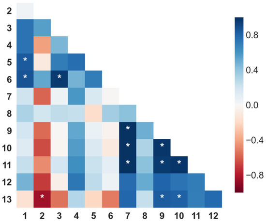 Pearson’s correlations among alkaloids of L. mirabilis from different extraction conditions. Dark blue: high positive correlation; dark red: high negative correlation. * Significant p value (p < 0.05). 1: α-isosparteine; 2: sparteine; 3: β-isosparteine; 4 and 5: unknown; 6: ammodendrine; 7: tetrahydrorhombifoline; 8: 17-oxysparteine; 9: α-isolupanine; 10: hydroxytetrahydrorhombifoline; 11: lupanine; 12: 13α-hydroxylupanine; and 13: 13-Docosenamide.