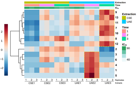 An integrative analysis of the alkaloidal composition and activity on F. oxysporum mycelial growth was performed employing multiple-covariate statistics to achieve a more general comprehension of the obtained results and infer reliable relationships. The main goal was to recognize patterns and predict plausible bioactive alkaloids within the extracts. Thus, following a suitable pretreatment and preprocessing of the GC-MS profiles, an alkaloid abundance table (AAT) was built. The overall information contained in the AAT was visualized through a heat map combined with hierarchical clustering (Figure 3). Two clusters were evidenced in this heat map, comprising compounds mainly accumulated in UAE2 and UAE3, respectively, which influenced the discrimination of mycelial growth inhibition (significantly lower IC50 values). Each cluster involved six different alkaloids.