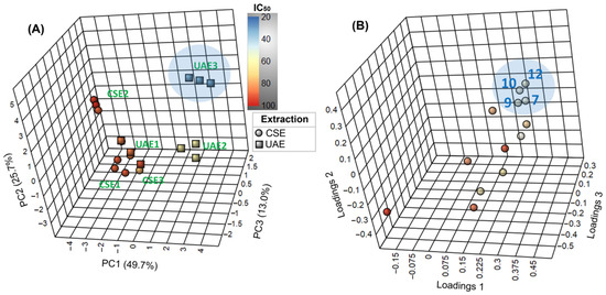 Two-factor principal component analysis (PCA) on the alkaloidal profiles of L. mirabilis under different extraction conditions. CSE1-3: conventional solvent extraction for 2, 4, and 6 h, respectively; UAE1-3: ultrasound-assisted extraction for 0.5, 1, and 2 h, respectively. (A) Three-dimensional scores plot. Samples colored by activity on F. oxysporum mycelial growth (expressed as IC50 in µg/mL). (B) Three-dimensional loadings plot. Compounds highlighted in blue ellipsoids are as follows: 7: tetrahydrorhombifoline; 9: α-isolupanine; 10: hydroxytetrahydrorhombifoline; and 12: 13α-hydroxylupanine.