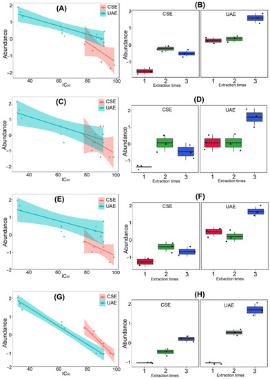 Therefore, the variation of these compounds along factors (i.e., the extraction type, extraction time, and IC50 values) is presented in Figure 5. A significantly higher abundance of the four top-ranked compounds in UAE3 compared with the other fractions derived from UAE and CSE was observed, supporting their statistical influence on sample discrimination regarding bioactivity. Hence, a noticeable change along the IC50 values was observed for compounds 7, 9, and 10, particularly in the ultrasound-assisted extraction at the longest time (i.e., UAE3), whose association between the abundance of these compounds and the activity was relevant (Figure 5A–F). However, the most drastic variations were experienced by alkaloid 12 (both by extraction type and time frame) since the slope of the linear regression is more pronounced along with IC50 values (Figure 5G) and involves significant differences between the extraction times for the UAE and CSE methods (Figure 5H). This observation could indicate a more plausible influence of 12 on the activity against the F. oxysporum strain. Highly abundant compounds, such as 2 and 11, could not be associated with the inhibitory activity since the changes in their abundance were not statistically relevant, and they behaved as a blank.