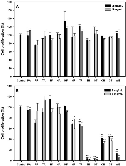 Cell proliferation of HSC-3 treated with various protein hydrolysates at the concentration of 2 and 5 mg/mL for 24 h (A) and 48 h (B). Data, mean ± SD (n = 3). * p < 0.05 and ** p < 0.01 against control. PA: Porcine skin gelatin/Alcalase; PF: Porcine skin gelatin/Flavourzyme; TA: Tilapia skin gelatin/Alcalase; TF: Tilapia skin gelatin/Flavourzyme; HA: Halibut skin gelatin/Alcalase; HF: Halibut skin gelatin/Flavourzyme; MF: Milkfish skin gelatin/Flavourzyme; TP: Tuna cooking juice/Protease XXIII; SB: Soy protein isolate/Bromelain; ST: Soy protein isolate/Thermolysin; CB: Sodium caseinate/Bromelain; CT: Sodium caseinate/Thermolysin; WB: Wheat gluten/Bromelain.