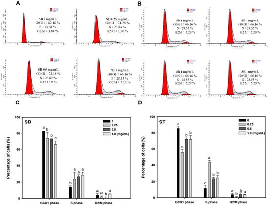 Effect of SB and ST on the cell cycle progression of HSC-3. (A,B) After the treatment of SB and ST at various concentrations for 72 h, HSC-3 cells were harvested, stained with propidium iodide, and analyzed by flow cytometry. Flow cytometric histograms are representative of three separate experiments. (C,D) Quantification of the percentage of HSC-3 cells treated by SB and ST in the cell cycle. Bars represent standard deviations from triplicate determinations. Different letters indicate significant differences (p < 0.05).