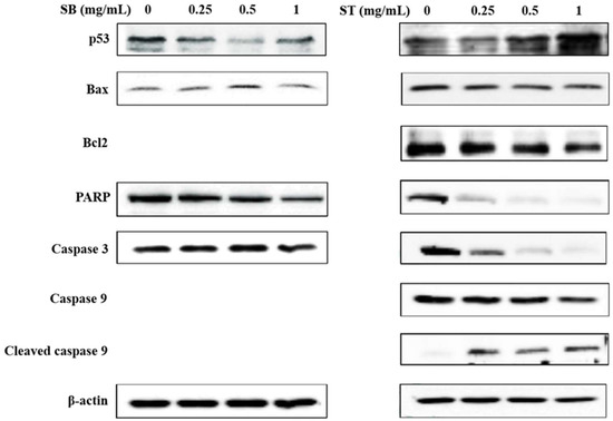 The expression of apoptosis-related proteins was investigated to analyze the underlying mechanisms by Western blot analysis. As shown in Figure 6, SB downregulated the expression of poly ADP-ribose polymerase (PARP) and upregulated the expression of Bax at the concentrations of 0.5 mg/mL; however, the other proteins did not show any significant changes. Treatment with ST resulted in a decrease in Bcl-2, PARP, caspase 3 and caspase 9 expression, and increases in p53 and cleaved caspase 3 expressions at the concentrations of 0.5 and 1 mg/mL. From the results, SB had no effect on the expression of apoptosis-related proteins, such as p53 and caspase 3. Therefore, we suggested SB maybe induce necrosis rather than apoptosis in HSC-3 cells. ST was supposed to induce apoptosis of HSC-3 cells by upregulating the modulator of apoptosis, p53, downregulating the apoptosis inhibitor, Bcl-2, and then activating the caspase-related proteins family and might be through the mitochondria-mediated pathway. This is in agreement with a previous study of berberine-induced apoptotic death of HSC-3 oral cancer cells via the mitochondrial pathway [25].