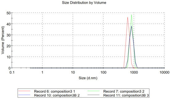 Size distribution by volume of TFG + S1. Each measurement consisted of 10 individual test runs. Average particle diameter was calculated by the software of the equipment.