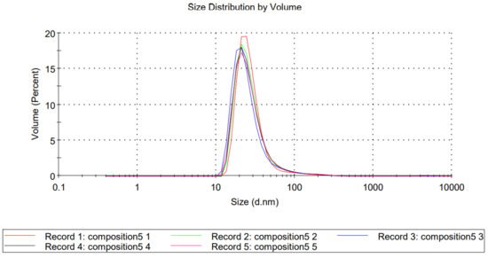DLS measurements were carried out using a Malvern Zetasizer Nano ZSP. Here, 1 mL of the sample SEDDS composition was diluted with 900 mL distilled water. The samples were allowed to equilibrate for 5 min at 25 °C before performing 5 measurements consisting of 10 individual runs each. The refractive index and absorption values of polystyrene latex were used.