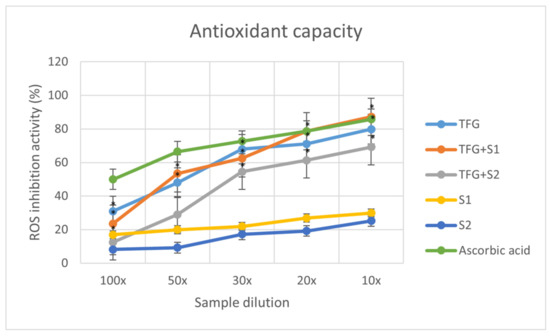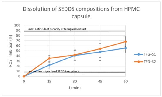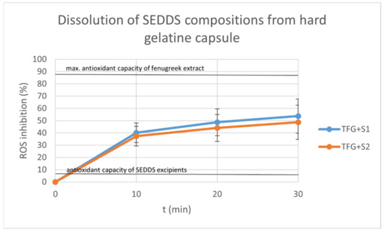 Dissolution of TFG + S1 and TFG + S2 from HPMC capsule over time. Each data point represents the mean ± S.D. inhibition percentage of 5 independent parallel dissolution test samples. The antioxidant capacity of the Trigonella extract alone and the antioxidant capacity of the SEDDS components alone are also displayed. At each time point, the means of the different compositions were compared with a Kolmogorov–Smirnov test, and no significant difference was found between the dissolution profiles (p < 0.05).