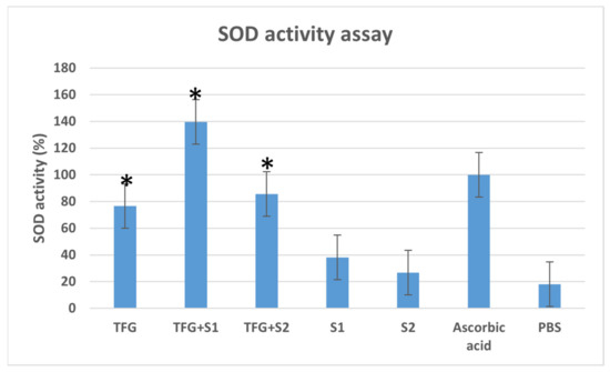 SOD enzyme activity in Caco-2 cells, expressed as the percentage of SOD activity in positive control cells, treated with ascorbic acid solution. Cells treated with PBS were used as the negative control. Data are expressed as the mean ± S.D. and n = 8, with * p < 0.05 compared with control.