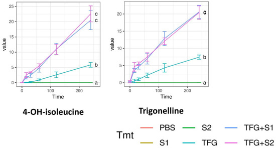 Permeability tests were carried out on cell monolayers presenting TEER values between 800 and 1000 Ω cm2. The concentration of the penetrated compounds over time is displayed on Figure 5, Figure 6 and Figure 7. S1, S2, and the negative control PBS showed zero values for all compounds. Significantly more compound permeated from the SEDDS formulations TFG + S1 and TFG + S2 than from the native fenugreek extract TFG. The permeability curves can be compared with Tukey’s HSD post-hoc test, while the curves marked with different letters differ significantly.