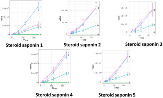 Abundance of Trigonella foenum-graecum compounds in the basal layer of Caco-2 cells, as measured by LC-ESI-MS. Steroid saponins were measured in positive ion mode. Data are given in raw abundance. Abbreviations denote compositions of the upper layer, as in Table 3. The curves marked with different letters differ significantly according to Tukey’s HSD post-hoc test.