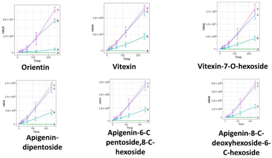 Abundance of Trigonella foenum-graecum compounds in the basal layer of Caco-2 cells, as measured by LC-ESI-MS. Flavonoid glycosides were measured in negative ion mode. Data are given in raw abundance. Abbreviations denote compositions of the upper layer, as in Table 3. The curves marked with different letters differ significantly according to Tukey’s HSD post-hoc test.