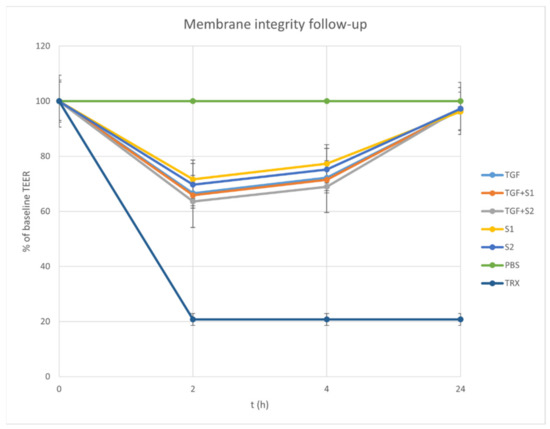 The membrane function was monitored using follow-up TEER measurements. After the permeability assay, TEER values increased in the fresh medium, and after 24 h the values were above 90% of the baseline TEER, as is displayed in Figure 8. The samples added to the inserts loosened the tight junctions of the cell layer, but in the fresh medium, this was restored slowly. The TEER value after 24 h was close to the baseline, which points to the survival of the cells in the fenugreek compositions. The reduction in TEER caused by Triton-X was constant until the end of the measurement, because the cells did not survive.