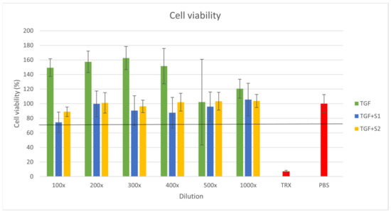 The MTT method was used for the cytotoxicity assay to determine the viability of Caco-2 cells after the treatment with compositions TFG, TFG + S1 and TFG + S2. A blank PBS treatment was used as a negative control, and the Triton X-100 (Sigma-Aldrich, Budapest, Hungary) treatment as the positive control. The cells were seeded at a density of 10,000 cells per well on flat-bottom 96-well tissue culture plates, and were allowed to grow for 7 days in a humified atmosphere of 5% CO2 at 37 °C.