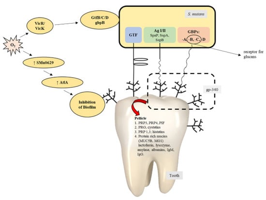 Oral biofilm formation begins with the attachment of S. sanguinis and other pioneering colonists to a macromolecular complex formed on the saliva-coated tooth surface [22,40,41,42]. S. sanguinis was the first bacterium to bind to the biofilm and a species that plays an important role in the oral biofilm ecosystem [43,44,45,46]. However, these bacteria also have a positive role, namely producing H2O2 as a means to produce excess oxygen and working as a non-specific antimicrobial agent that can trigger the growth of S. mutans and other anaerobic periodontal pathogens [47,48,49].
