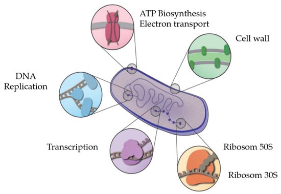 Pathway of inhibition of bacteria by antibacterial agents [73].