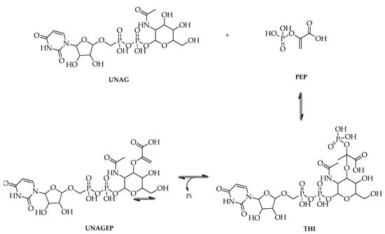 In addition, the antibacterial mechanism can be carried out by inhibiting the action of the MurA enzyme that catalyzes the first step of bacterial cell wall biosynthesis. Therefore, the inhibition of the activity of oral pathogenic bacteria can be undertaken by inhibiting the enzyme MurA [104]. In cell wall peptidoglycan biosynthesis, the enzyme MurA involves the transfer of the enolpyruvate group from phosphoenolpyruvate (PEP) to UDP-N-acetylglucosamine (UNAG) to form UDP-N-acetylglucosamine enolpyruvate (UNAGEP) [90,91].