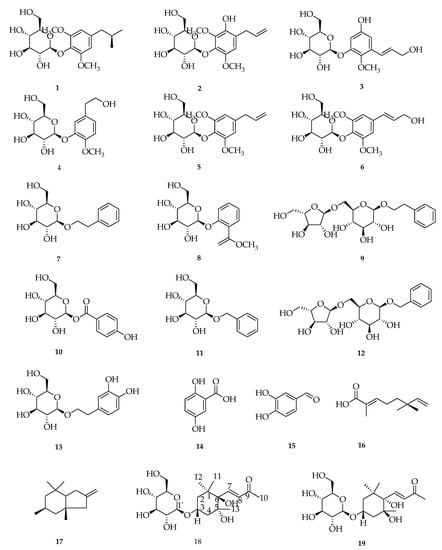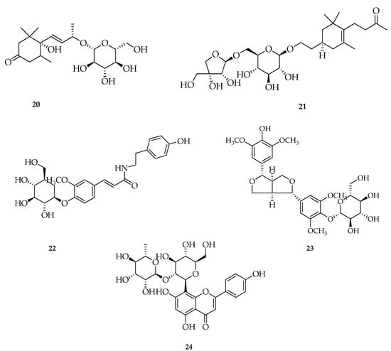 Several studies reported the isolation of P. crocatum Ruiz and Pav by many methods. Li et al., 2019 isolated 2.60 kg of dried red betel leaf samples, then extracted by reflux method using methanolic solvent (5 L × 3 times). The results of the isolation of P. crocatum Ruiz and Pav leaves revealed 23 compounds including 15 phenolic compounds (1–15), two monoterpenes (16 and 17), three sesquiterpene compounds (19–21), phenolic amide glycosides (22), neolignans (23), and the flavonoid compound C-glycoside (24). The structure of the compounds obtained was identified through spectroscopic methods and compared with the literature. Seven compounds (7, 11, 13, 14, 17, 20, and 24) of the species P. crocatum Ruiz and Pav and 17 others (1–6, 8–10, 12, 15–16, 18–19, and 21–23) from the genus Piper and the family Piperaceae were isolated and reported for the first time [117] (Figure 5).