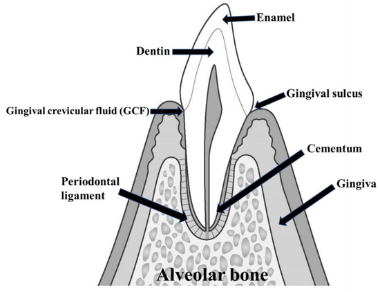 Periodontal disease includes any disorder occurring in periodontal tissue, consisting of the gingiva, cementum, periodontal ligament, and alveolar bone (Figure 1) [1,2,3,4,5,6,7]. The main periodontal diseases are gingival lesions and periodontitis, but also include nonplaque gingival lesions, gingival proliferation, necrotizing periodontal disease, abscesses of periodontal tissue, periodontal and endodontic lesions, gingival recession, and occlusal trauma [8,9,10,11,12,13,14]. Periodontal disease is one of the two major dental diseases, along with dental caries, and is the most significant cause of tooth loss. Recently, it has also become clear that periodontal disease is associated with systemic diseases, such as diabetes and aspiration pneumonia, and is now addressed as a lifestyle-related disease.