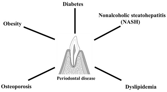 Periodontology is a new field relative to other areas of dentistry. In recent years, there has been remarkable progress in research, clinical practice, and education related to periodontology [21,22,23]. As suggested by the term “periodontal medicine,” it is associated with systemic diseases. Metabolic disease groups that have been reported to be associated with periodontal disease include diabetes, obesity, nonalcoholic steatohepatitis (NASH), dyslipidemia, and osteoporosis (Figure 2). Therefore, overcoming periodontal disease through appropriate treatment can help preserve teeth and contribute significantly to improving patients’ quality of life.