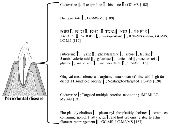 Recently, Chen et al. characterized the gingival metabolome of mice with high-fat diet (HFD)-induced obesity with and without periodontitis [120]. The gingival metabolome and arginine metabolism were analyzed by nontargeted/targeted LC-MS. They concluded that the obese population fed an excessive HFD displayed an amplified metabolic response to periodontitis, exhibiting metabolic susceptibility to exacerbated periodontal destruction [120]. This study indicated the use of gingival metabolome based on MS technology nontargeted/targeted LC-MS in periodontal disease research and potential applications.