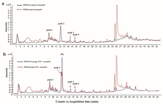 Chromatograms of the methanol extract of marigold before and after reaction with DPPH radicals (a); chromatograms of the methanol extract of marigold with PG chromatogram before and after reaction with DPPH radicals (b).
