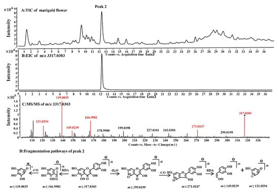 Screening of compound 2 by accurate-target means in the TIC (A), EIC (B) and MS/MS spectra (C) and the fragmentation pathway of compound 2 in the methanol extract of marigold flower (D).