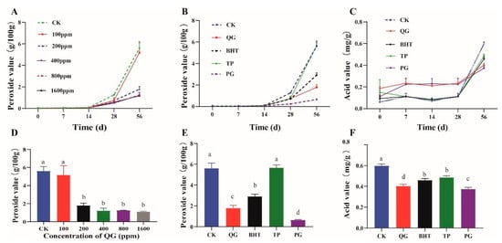 The peroxide value (PV) was used to measure the degree of primary oxidation of soybean oil after five different periods (0, 7, 14, 28 and 56 days). As shown in Figure 3A, increases in the accelerated oxidation time and the concentration of added QG resulted in stronger inhibitory effects. Interestingly, the oils with 200, 400, 800 and 1600 ppm QG showed lower PVs than the pure oil (CK). When the oil was treated with 100 ppm QG, the PV showed no significant difference compared with that for pure oil. Therefore, we speculate that 200 ppm QG in soybean oil exhibits very good antioxidant effects. As shown in Figure 3D, on the 56th day of accelerated oxidation, the measured PV showed that the addition of higher concentrations of QG to soybean oil led to lower PVs and stronger antioxidant effects, which indicated that the antioxidant capacity of QG with soybean oil was related to the concentration of QG. Additionally, the PV data showed that the sample treated with 1600 ppm QG was most affected, with approximately 8.5 times the level of lipid peroxidation compared to the pure oil, which indicated that QG prolonged the initiation stage of soybean oil oxidation. As shown in Figure 3B, a comparison of the three positive controls with the extension of accelerated oxidation time showed that the PV did not significantly change from 0 to 14 d, and it gradually increased after 14 d. As shown in Figure 3E, on the 56th day of accelerated oxidation, the PV decreased in the order CK > TP > BHT > QG > PG. This showed that QG had good antioxidant activity and prevented the rancidity of soybean oil, and the effect of QG was obviously better than those of TP and BHT but slightly weaker than that of PG. In addition, the content of free fatty acids in soybean oil can be determined by measuring the acid value (AV) of the oil. As shown in Figure 3C, the AVs of the pure oil samples increased as the accelerated oxidation time was increased; however, only the AV measured during the latest accelerated oxidation period (i.e., after 56 days) showed a significant difference. As shown in Figure 3F, on the 56th day of accelerated oxidation, the AVs of the soybean oil samples treated with 200 ppm positive control and QG were significantly reduced compared with that of pure soybean oil after 56 days of accelerated oxidation, and the magnitude of AV decreased in the order CK > TP > BHT > QG > PG; these results were consistent with those for PV, which indicated that QG effectively retarded the oxidative rancidity of soybean oil, and the effect was even better than those of BHT and TP. Our results were consistent with data reported in other studies on the use of BHT and natural extracts to inhibit primary lipid oxidation.