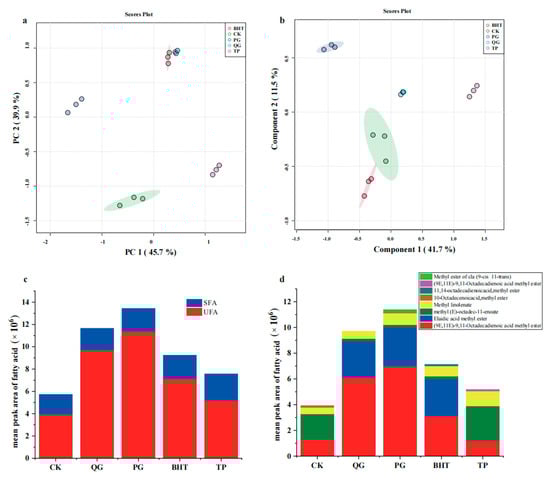 Fatty acid composition of oil treated with different antioxidants: PCA score plot (a); PLS-DA score plot (b); mean peak area of saturated fatty acids (SFAs) and unsaturated fatty acids (UFAs) (c); mean peak area of various unsaturated fatty acid (d).
