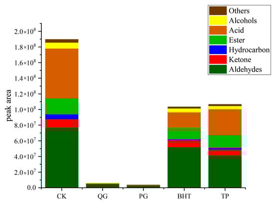 To further understand the effect of QG on the oxidative stability of soybean oil subjected to accelerated oxidation, HS-SPME-GC-MS was used to analyse the volatile compounds (Table S2). Analyses of the volatile components in soybean oil identified 108 volatile components, including 16 alcohols, 23 aldehydes, 25 ketones, 4 acids, 15 esters, 18 hydrocarbons and 7 others (Figure 5a). Compared with the control group, the amounts and contents of volatile components were significantly reduced by antioxidant treatment. The most dramatic declines were seen for soybean oil treated with PG and QG. Specifically, the CK group contained 69 volatile constituents representing 63.9% of the total, while the QG and PG groups only exhibited 17.6% and 14.8% total volatile components (Figure 5b). Using a Venn diagram, we observed that these volatile components comprised seven components, including hexanal, octanal, trans-2-heptenal, (E)-2-octenal, butanoic acid, 2,2-dimethylethenyl ester, trans, trans-2,4-nonadienal and trans, trans-2,4-decadien-1-al, which were observed for all groups (Figure 5c). Additionally, the highest proportion of volatile components (46.36% of the total peak area) was found for the CK group, while the QG and PG groups only accounted for 1.45% and 0.87% of the total peak areas (Figure 6). In conclusion, the addition of QG retarded the production of volatile components in soybean oil and blocked the production of acids and alkanes. Moreover, the antioxidant capacity of QG was comparable to that of the known antioxidant (PG) but significantly better than those of BHT and TP. Most importantly, the trend for the degree of inhibition of volatile profiles was consistent with the trends for the peroxide value, acid value and fatty acid content.