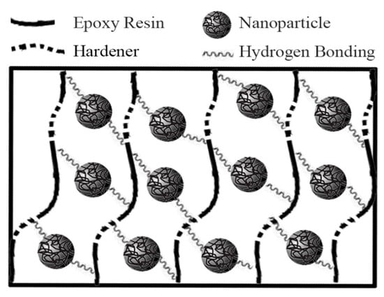 A certain amount (0.5, 1 and 1.5 wt.%) of UFNBRP was pre-mixed with epoxy resin at a mixing rate of 2000 rpm to obtain the optimum mixing condition. After approximately 20 min, the solution was completely sonicated and mixed again with a homogenizer for 20 min at 10,000 rpm. After adding the hardener, the mixing was continued for 2 min at 2000 rpm. The mixture was vacuum-dried at environment temperature for 1 h before mixing and 2 h after mixing to obtain bubble-free samples. Afterwards, the samples were immediately used for the rheological test. The illustration of the structure of epoxy resin intercalated with UFNBRP is shown in Figure 1.