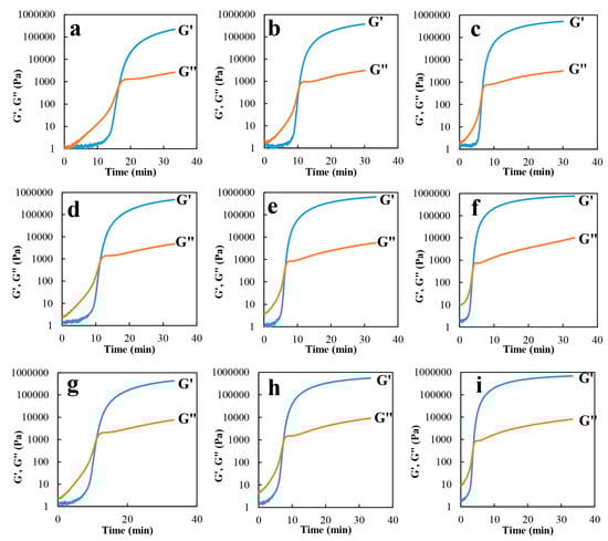 The rheological behavior plays an important role in controlling the curing process, which leads to improving the quality of the final product [,,]. One of the advantages of the rheological measurements is that they can directly show the storage modulus variations like elasticity in the curing process, which is linked to the physical and chemical properties of the final product [,,].