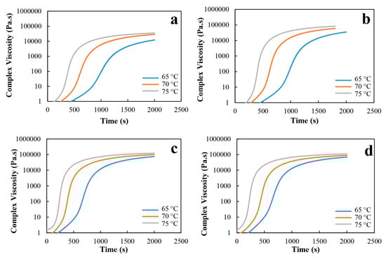 The complex viscosity versus time at different temperatures of 65, 70 and 75 °C for (a) epoxy resin, (b) epoxy resin/0.5% UFNBRP (c) epoxy resin/1% UFNBRP and (d) epoxy resin/1.5% UFNBRP.