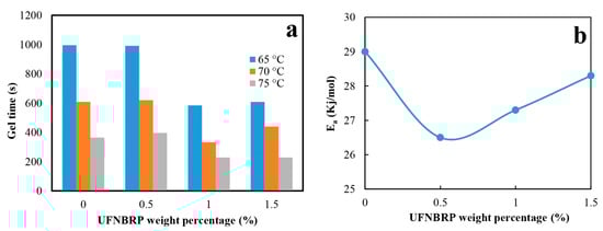(a) Gel time diagram for the epoxy resin and epoxy resin/UFNBRP nanocomposites and (b) activation energy diagram of neat epoxy resin at different elastomeric nanoparticles concentrations.