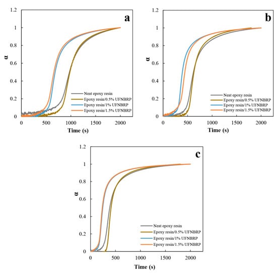 Variation in the curing rate of epoxy resin/UFNBRP nanocomposites at different temperatures of (a) 65 °C, (b) 70 °C, and (c) 75 °C.