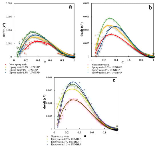 The curing rate of epoxy resin and epoxy nanocomposites are depicted in Figure 8. As can be observed, the curing rate reaches a maximum value at a specified curing value, which could be known as a signal showing that the laboratory data follow the Sestak–Berggren autocatalytic model. We also have a slight deviation at low temperatures because of the large number of reactive groups’, which occurs at low conversion rates [,].