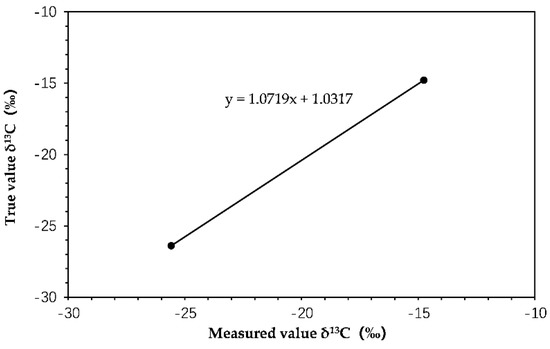 The measured δ13C values of the reference materials USGS62 and USGS40 were −14.76 ± 0.1‰ and −25.58 ± 0.05‰, respectively. The standard deviation was within the instrumental uncertainty (±0.5‰), indicating that the measured results were reliable. The linear regression between the measured values and the true values was performed and shown in Figure 1. The slope of the regression was 1.072, very close to 1, indicating that the instrument was in good working order and had high accuracy. The δ13C values of the pure HCHs determined under this system were shown in Table 2. The δ13C values of HCHs directly measured by EA-IRMS were used as the measured value y, and the two-point correction was substituted into the regression equation to obtain the corrected δ13C values. The δ13C values of α-, β-, γ-, and δ-HCH were −25.58 ± 0.02‰, −25.69 ± 0.05‰, −27.68 ± 0.03‰, and −26.74 ± 0.03‰, respectively (Table 2). The standard deviations were between 0.02–0.05‰ (<±0.5‰), indicating the results were reliable and accurate. These δ13C values of the pure HCHs were used to evaluate the accuracy of the GC-IRMS system.