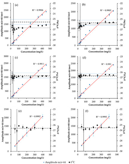 The method detection limits and linearity range of HCHs. (a) α-HCH (b) β-HCH, (c) γ-HCH, (d) δ-HCH. (e) (+)α-HCH (f) (−)α-HCH. The diamonds represent the δ13C values in per mil and the squares show the amplitude of mass 44 in mV. The dashed lines represent the intervals of δ13C measured by EA-IRMS ± 0.5‰. Each point was measured three times, and the error bars represent the standard deviation.
