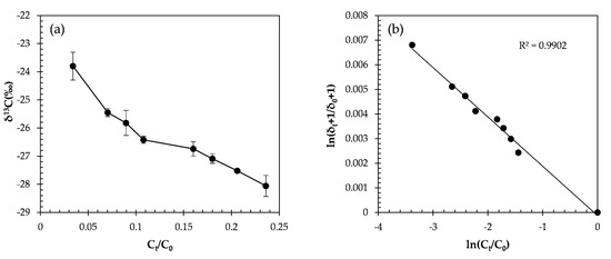 The α-HCH transformation by CaO2: (a) remaining fraction and carbon isotope ratios for oxidation by CaO2; (b) double logarithmic plot according to the Rayleigh equation.