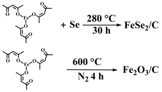 Two mmol of ferric acetylacetonate (C15H21FeO6), 4.4 mmol of Selenium powder (Se) and 1 g of sodium chloride (NaCl) were dissolved in 15 mL absolute ethanol to form uniform slurry in the same way. The FeSe2@C composite was obtained by annealing in the muffle furnace at 280 °C for 30 h with a heating rate of 2 °C min−1. The synthetic path of the samples is shown in Figure 1.