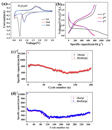 Electrochemical properties of the Fe2O3@C electrode: (a) Cyclic voltammograms between 0.01 and 3 V at a potential sweep rate of 0.1 mV s−1. (b) Discharge/charge profiles at 0.2 A g−1, and (c,d) Cycling performance at 0.2 A g−1 and 0.5 A g−1, respectively.