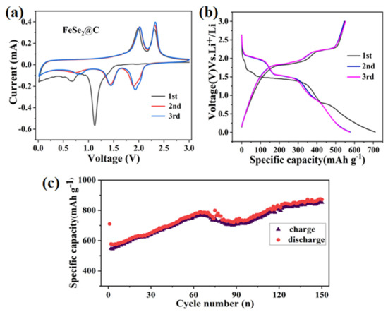 To study the lithium-ion storage behavior of the FeSe2 electrode, cyclic voltammetry (CV) of the first three cycles was firstly recorded at a scan rate of 0.1 mV s−1 in the voltage range of 0.01–3.0 V as shown in Figure 9a. From the diagram, there are two pairs of redox peaks, indicating the occurrence of two electrochemical reactions. In the first cathodic process, two reduction peaks around 1.13 V and 0.7 V were attributed to the generation of LixFeSe2, the formation of the SEI layer decomposed by the electrolyte and the formation process of FeSe and Li2Se [22], respectively. Meanwhile, two oxidation peaks at 2.0 V and 2.2 V appeared in the initial anodic cycle, corresponding to the formation of LixFeSe2 and FeSe2, severally. In addition, the cyclic voltammetry curves of the first lap are obviously different from the subsequent cycles, in which the formation of SEI film on the surface of the FeSe2@C electrode led to a lower Coulomb efficiency during the first charge-discharge process. In the subsequent cycles, the sharp peak at approximately 1.2 V shifts to 1.6 V, indicating the activation process in the first cycle. The redox peaks of the second and third cycles did not change significantly, in which lithium intercalation is only a fraction of the subsequent intercalation and removal of lithium ions, not affecting the internal structure of the FeSe2 during the charge and discharge process.