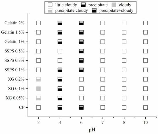 To explore the interaction between CP and hydrocolloid (XG, Gelatin, and SSPS), the phase behavior of the complex system was observed []. The state diagrams for the complex system under different pH and hydrocolloid concentration conditions are shown in Figure 1. The state diagrams reveal that the CP exhibits different phase behaviors when compounded with different hydrocolloids. Likewise, the concentration of hydrocolloids affected phase behavior.