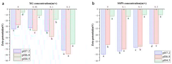 The zeta potential of CP-Hydrocolloid systems at different pH values and different concentrations of the three hydrocolloids. The CP concentration was 1% (w/v). Letters a–d indicate significant difference in different pH (p < 0.05). (a) CP-XG; (b) CP-SPSS; (c) CP-Gelatin. (CP-Coconut protein, XG-Xanthan gum, SSPS-Soluble soybean polysaccharide).