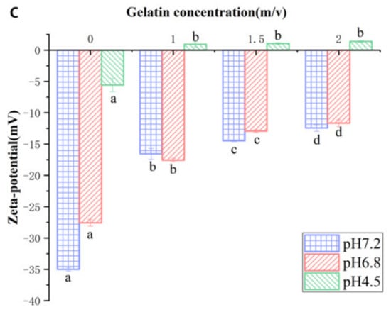 The potential of the complex system also changed with the addition of (and change in the concentration of) hydrocolloid. The potential of the CP-XG complex solution decreased with an increase in the concentration of XG. This is likely due to an electrostatic attraction between the negatively charged XG and positively charged fragments on the CP molecule []. The potential of the CP-SSPS complex solution did not change significantly with SSPS concentration. The potential of the CP-Gelatin complex solution increased with an increase in the concentration of gelatin. Moreover, the absolute value of the potential decreased significantly with gelatin concentration. Thus, the gelatin and CP interact, and this interaction causes the protein in the system to aggregate, making the protein less stable [].