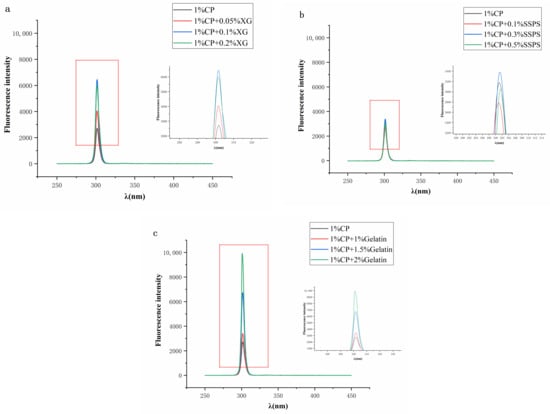 The fluorescence scanning spectrums of the CP-hydrocolloid composite solutions are shown in Figure 4. The λmax value of CP-XG (301.5 nm) did not change with XG concentration (within our experimental concentration range). The λmax value of CP-SSPS demonstrated a slight red shift with SSPS concentration. Thus, the conformation of CP changed in the presence of SSPS, with the tryptophan residues moving to a more hydrophilic environment. The λmax value of the CP-Gelatin composite solution did not change with gelatin concentration (within our experimental concentration range).
