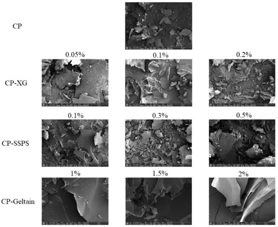 Scanning electron microscopy was used to observe the microscopic morphology of CP and CP-hydrocolloid complexes (Figure 5). The addition of different hydrocolloids had a significant impact on the microstructure of the CP-hydrocolloid complex. In the absence of hydrocolloid, CP demonstrated a bulky and loose structure. In contrast, CP-XG complex demonstrated a denser structure with smaller pores. The CP-Gelatin complex demonstrated a smooth surface and a large complete block structure. Finally, the CP-SSPS complex demonstrated a loose and uneven structure.